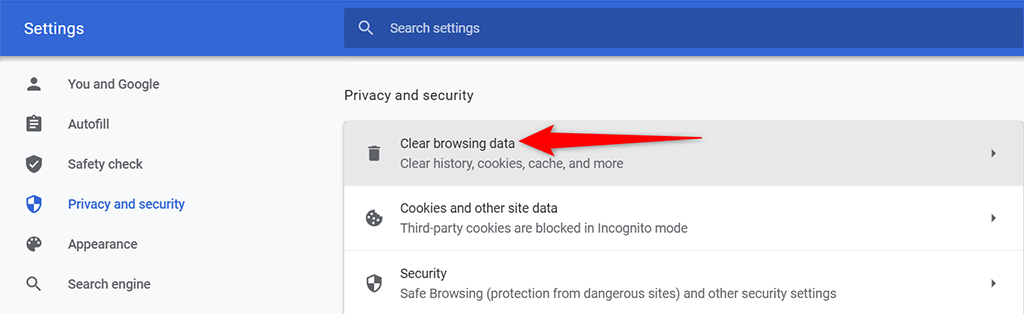 - On the Settings screen, select **Privacy and security** from the left sidebar and then choose **Clear browsing data** on the right.