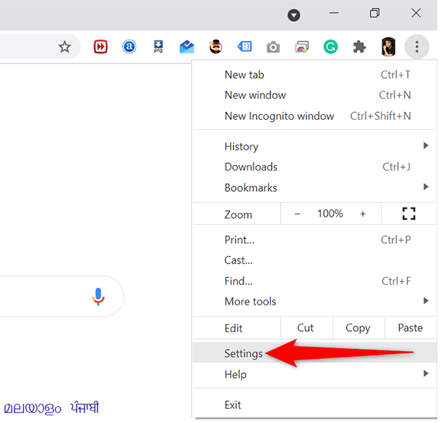 - Select the three dots at the top-right corner of Chrome and choose Settings.