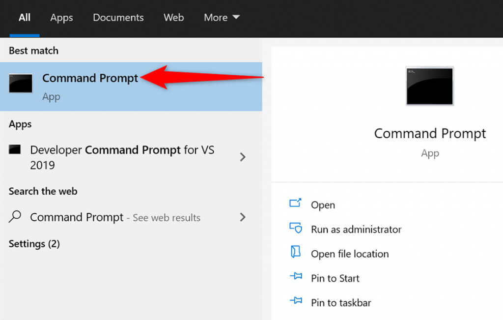 - Open the **Start **menu, search for Command Prompt, and select Command Prompt in the search results.