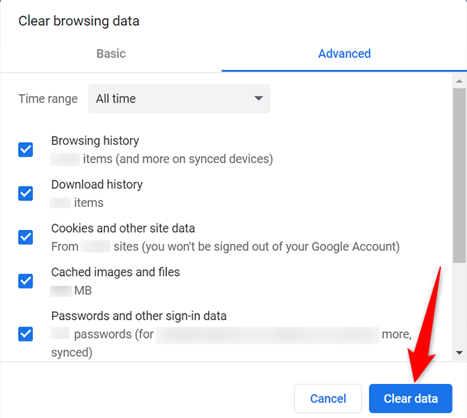 - In the Clear browsing data window, select the **Advanced **tab at the top. * Select **All time** from the **Time range** dropdown menu. Then, enable all the boxes in the list.