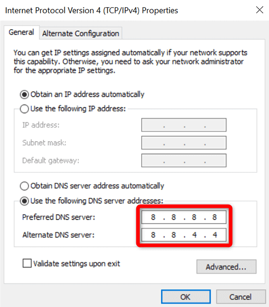 - Alternate DNS server: 8.8.4.4