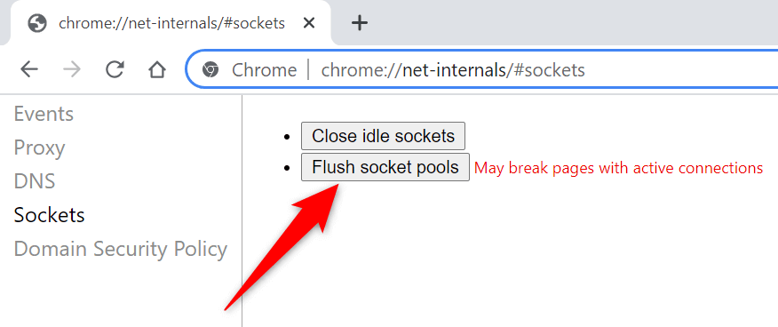 - Choose **Sockets **from the left sidebar. * Select the **Close idle sockets** button. Then, select the **Flush socket pools** button.