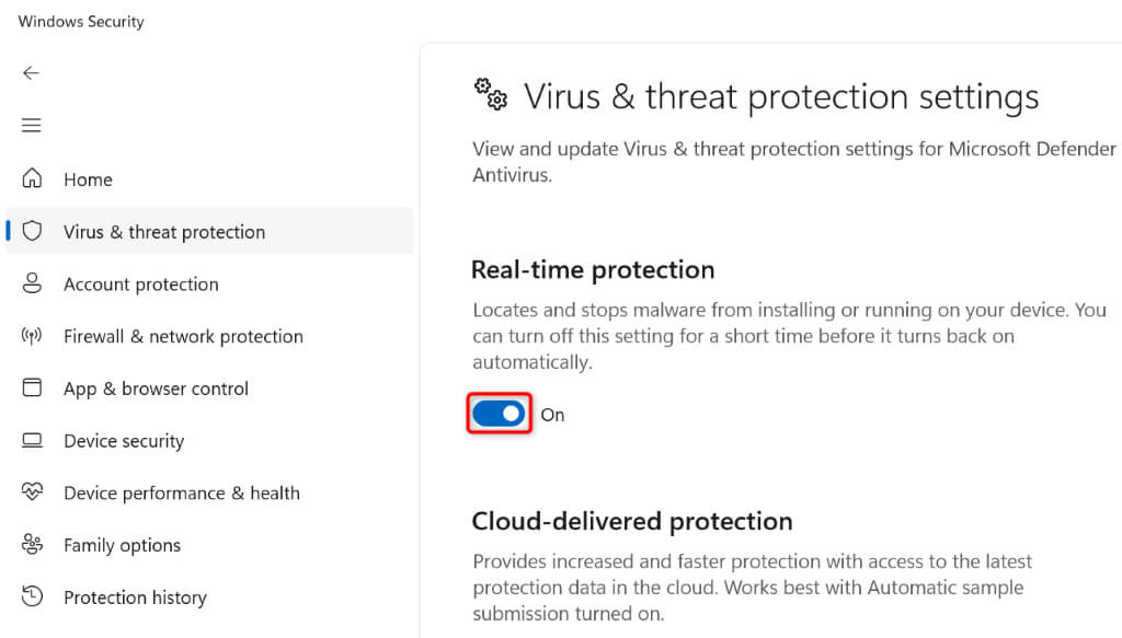 - Turn off the Real-time protection toggle.