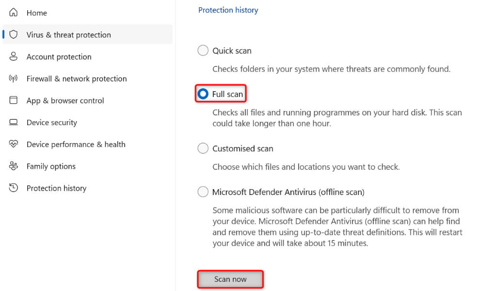 - Enable Full scan and choose Scan now.