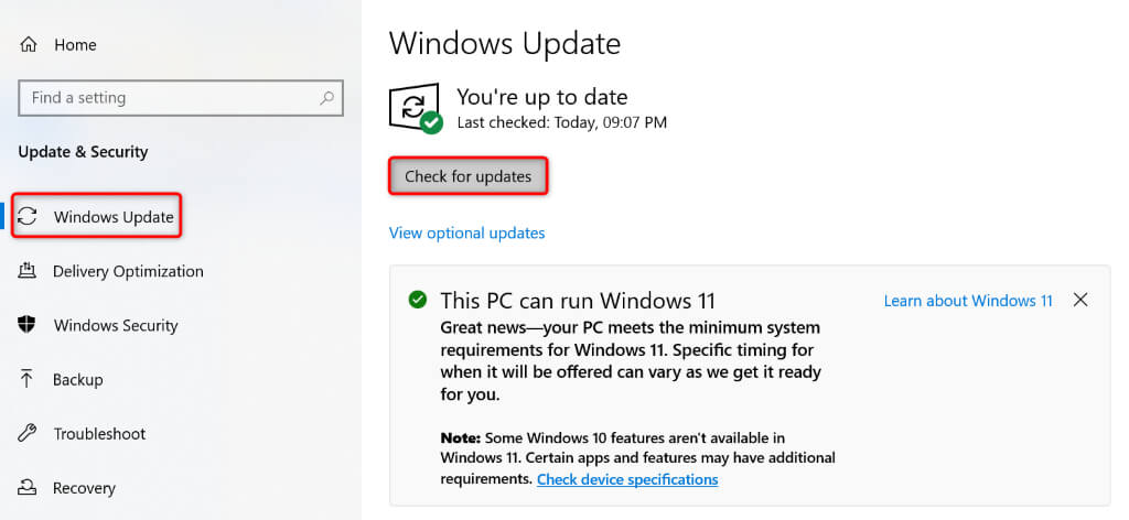 - Access Settings by pressing Windows + I. * Select Update & Security in Settings. * Choose Windows Update in the left sidebar. * Select Check for updates on the right pane.