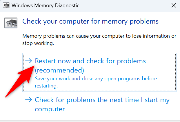 - Select Restart now and check for problems (recommended) in the open dialog box.
