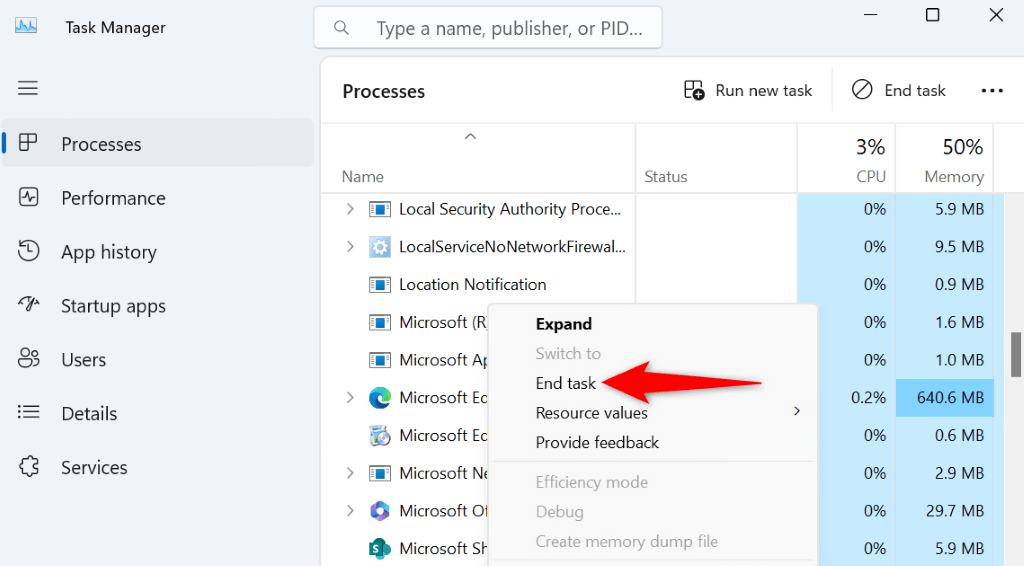- Find and right-click your faulty app on the list and choose End task.