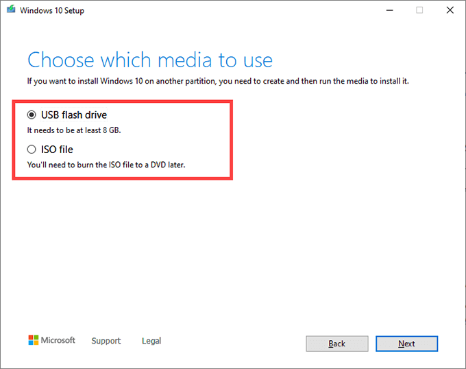 Choose USB flash drive. Or, select ISO file if you want to create a bootable DVD. Insert a flash drive or dual layer DVD and select Next.