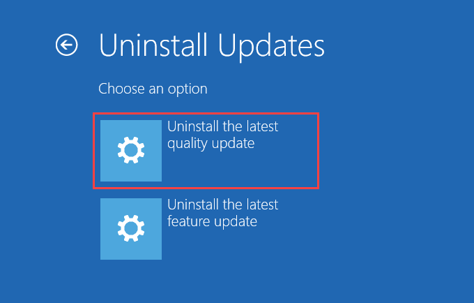 Select Uninstall Updates from within the Windows Recovery Environment. Then, pick the Uninstall the latest quality update option to roll back the latest incremental update.