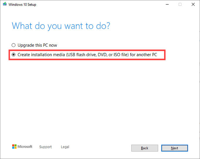 Pick the **Create installation media (USB flash drive, DVD, or ISO file) for another PC **option and select Next.