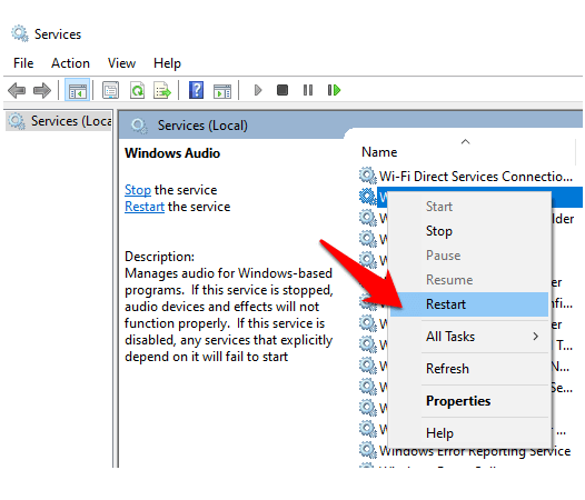 Right-click Windows Audio, Windows Audio Endpoint Builder and Remote Procedure Call (RPC) and select Restart.