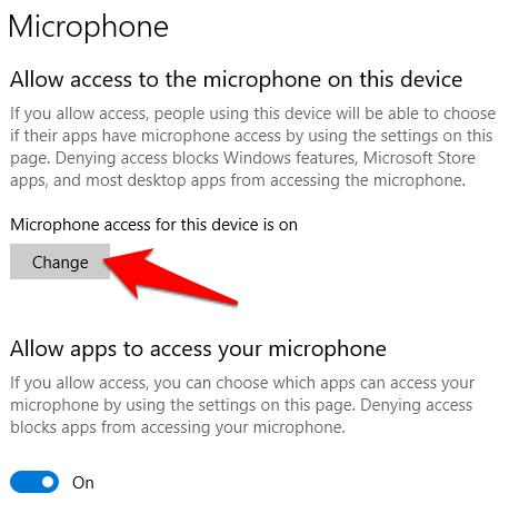 Click Change under the Allow access to the microphone on this device setting with the switch toggled to On.