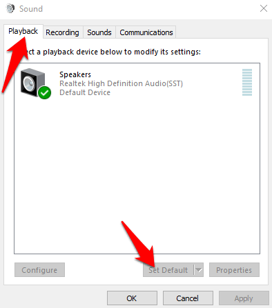 Click OK and check if you get any audio now. You can repeat these steps for all your default devices.