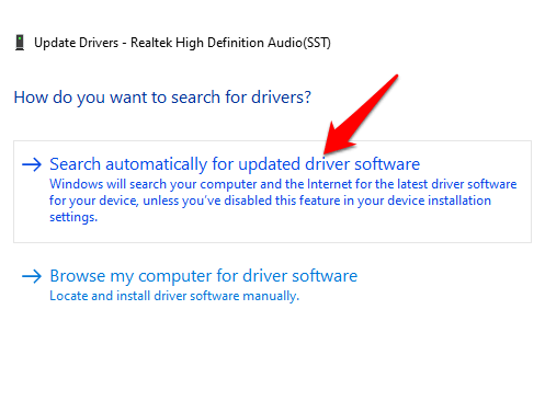 Windows will search for a new driver. If not, check the device manufacturer’s website to download an updated audio driver.