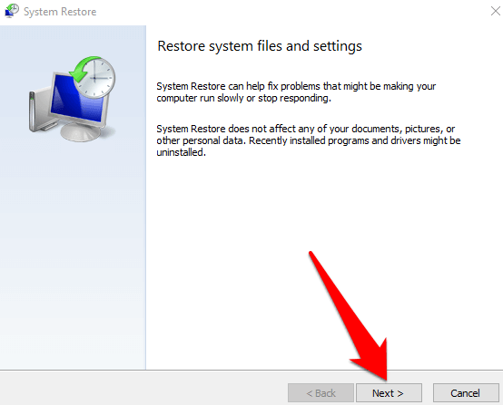 Click Next in the Restore system files and settings box.