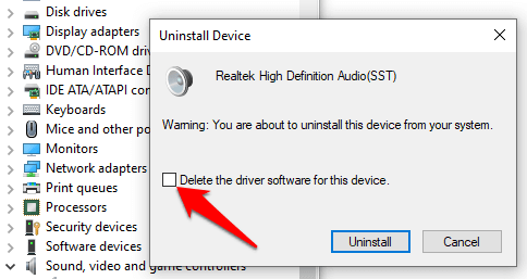 If updating the audio driver didn’t help, uninstall it and restart your PC to reinstall the driver. To do this, go to Device Manager > Sound, video and game controllers and right-click your audio device or sound card. Select Uninstall device.