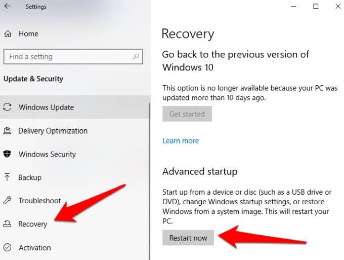 Click Recovery and then click Restart Now under Advanced Startup.