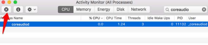 To quit the coreaudiod process, you can open Activity Monitor, type coreaudiod in the search box and click Force Quit.