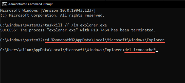 If restarting File Explorer or your PC doesn’t help, a corrupt icon cache is the most likely reason for the issue. Deleting the icon cache can help. The fastest way to do that is to run several commands via an elevated Command Prompt console.