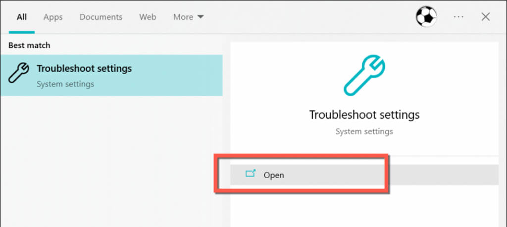 - Press Windows + S to open Windows Search. Then, type troubleshoot settings, and select Open.