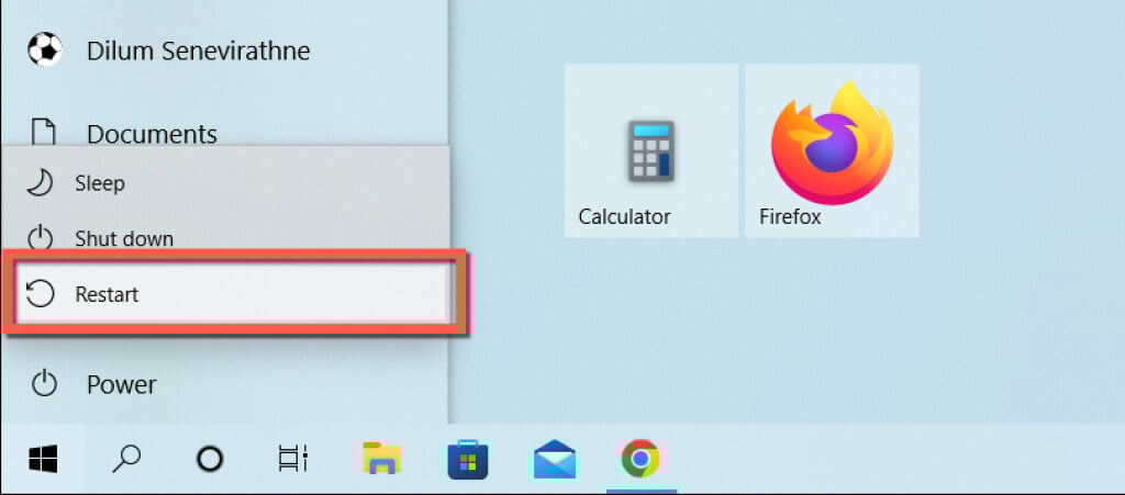 Restarting your PC is a quick fix to resolving unexpected network issues preventing Chrome and other apps from connecting to the internet. If you haven’t done that already, open the Start menu and select Power > Restart.