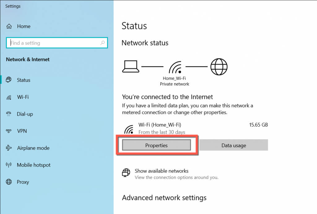 - Select Properties next to your active Wi-Fi or Ethernet connection.