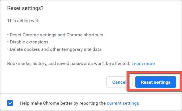 A Chrome reset procedure clears the web cache, disables active extensions, and reverts settings to factory defaults. All that combined resolves hidden conflicts and other issues. You will not lose your bookmarks and passwords, so if you want to go ahead: