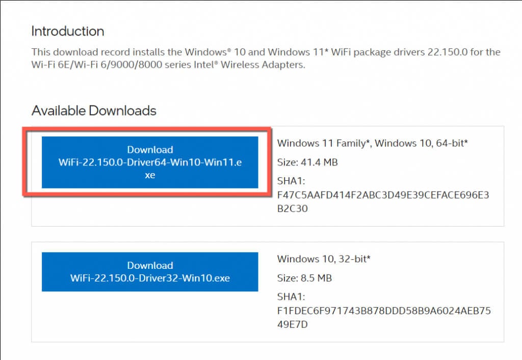 - Visit the manufacturer’s website—e.g., Intel—using a PC or Mac with internet connectivity and download the latest driver for the network adapter.