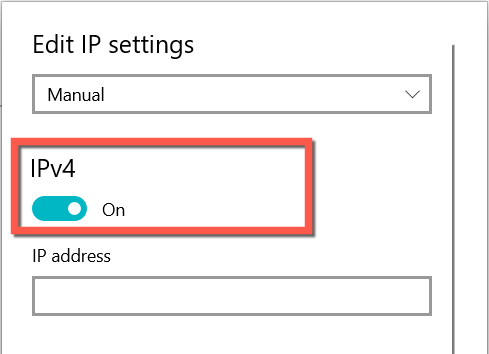 - Set Edit IP settings to Manual and turn on the switch next to IPv4 (Internet Protocol Version 4).