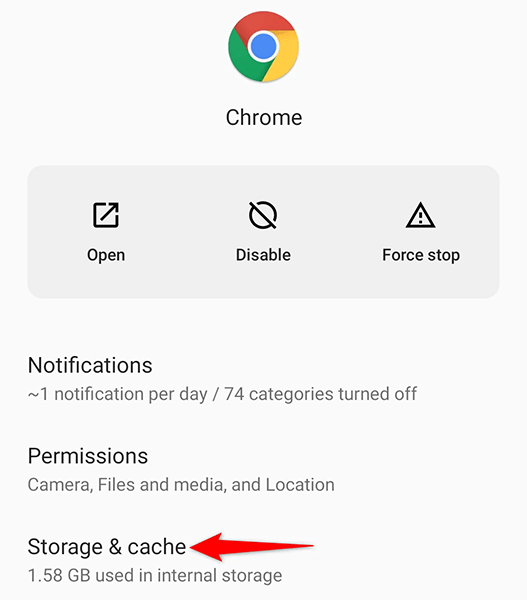 - Tap Storage & cache on Chrome’s app page.