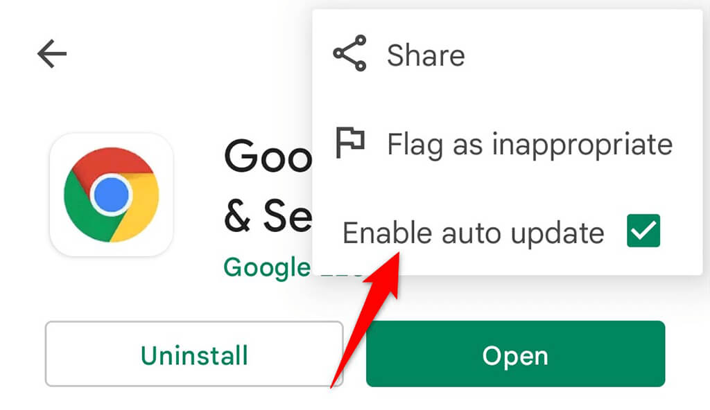 - Select **Update** to update the browser on your phone. * Optionally, enable automatic updates for Chrome by tapping the three dots at the top-right corner and choosing the **Enable auto update** option.