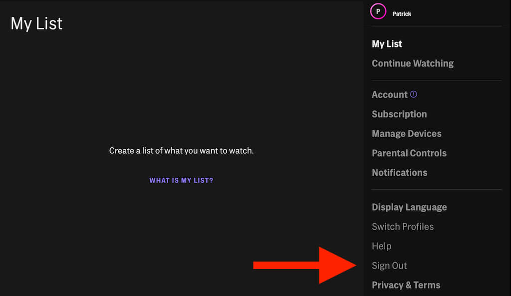 Signing out works differently on every device, but when streaming through a browser, select your name in the top-right corner and then select Sign Out.