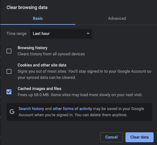 - Select the checkbox beside Cookies and other site data and Cached images and files, then select Clear data.