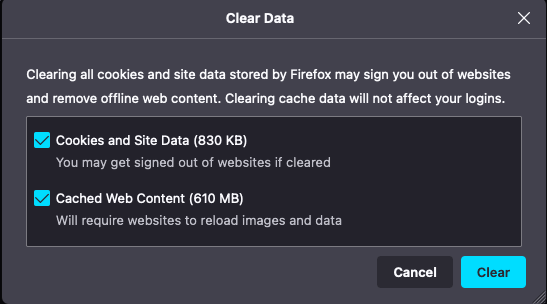 - Select both Cookies and Site Data and Cached Web Content and then select Clear.