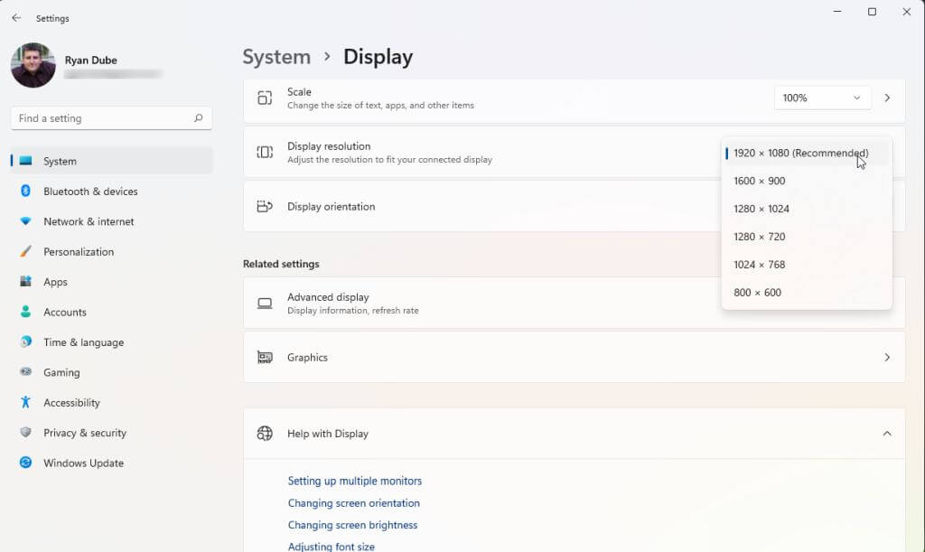 - Scroll down the right pane and find the Display Resolution section. Use the dropdown on the right to select the maximum resolution setting that you know the brand and model of your monitor is capable of.
