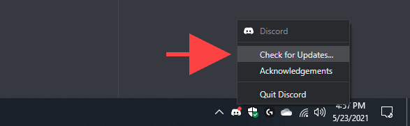 Running an outdated version of Discord is another reason for lag issues, so it’s a good idea to apply any pending updates immediately. You can request the app to check for and install the latest updates by right-clicking the **Discord **icon within the system tray and selecting Check for Updates.