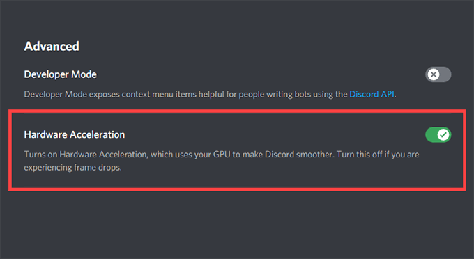 By default, Discord relies on hardware acceleration (which utilizes the GPU) to improve performance. However, if you’ve disabled the functionality within the app, that can end up creating severe Discord lag issues. Re-enabling it should help fix that.