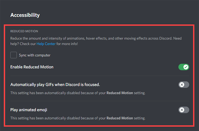 Activate the switch next to Enable Reduced Motion. Then, turn off the switches next to Automatically play GIFs when Discord is focused and Play animated emoji.