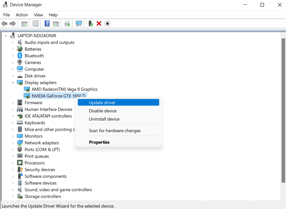 Apart from general OS updates, you should update your graphics card driver. To update your graphics card driver, head to the Device Manager and select Display Adapters.