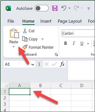 - Navigate to the new workbook you just created and select an empty cell (typically starting with cell A1 in the top-left).