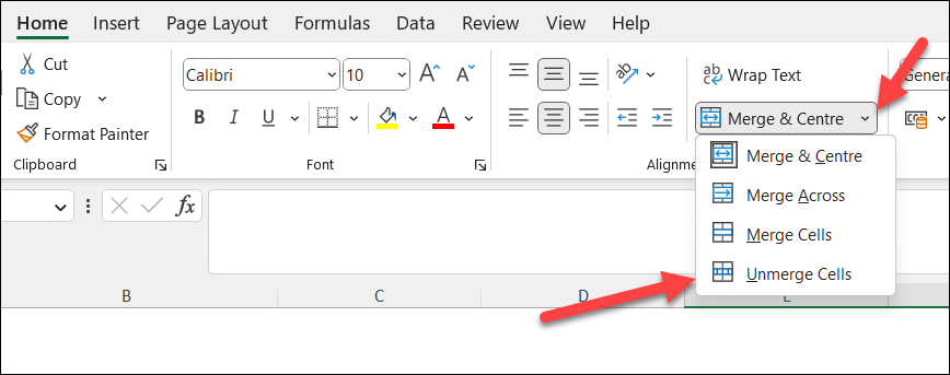 - Navigate to the Home tab on the ribbon bar and press the Merge & Center drop-down arrow in the Alignment section.