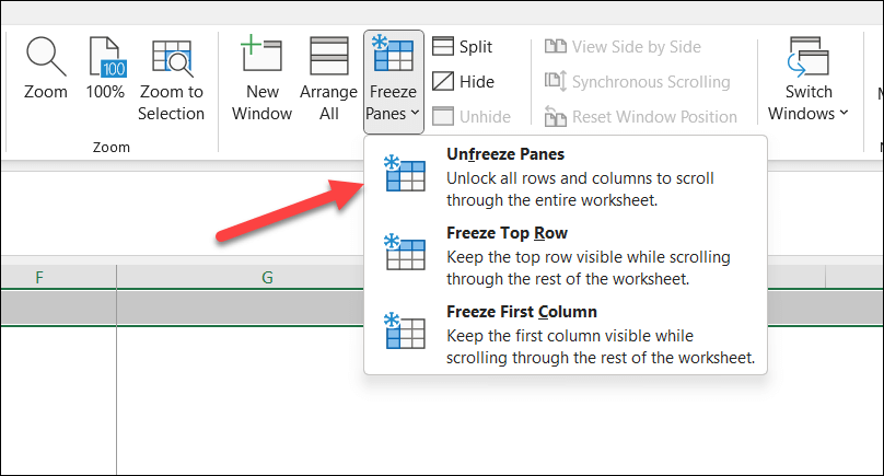 - Press the Freeze Panes button and select Unfreeze Panes from the drop-down menu.