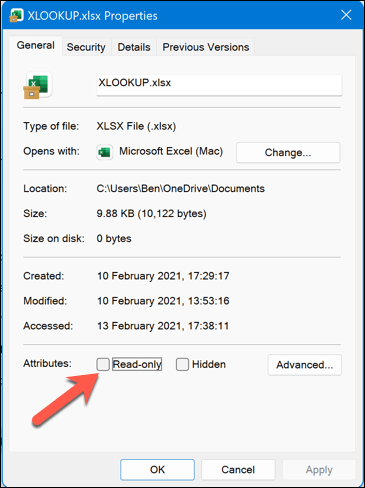 - Disable Read-only mode: Make sure that the file is not set to read-only mode. You can check this by right-clicking on the file, selecting Properties, and unchecking the Read-only attribute in the General tab if it’s enabled.
