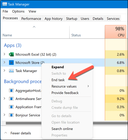 If Excel doesn’t close, you’ll need to open Task Manager and force the excel.exe application to terminate.