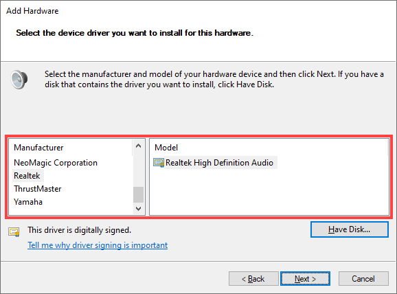 - Select the audio manufacturer from the list to the left of the screen. Then, select the model from the right side. If you have a disk that contains the drivers for the audio device, select **Have Disk **and specify the disk’s location. Select **Next **to continue.
