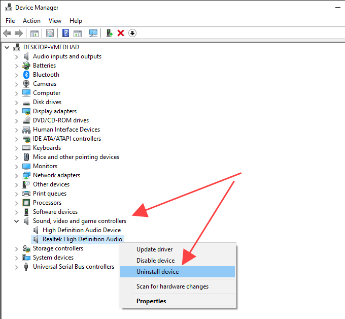 Right-click your computer’s audio device and select Uninstall Device.