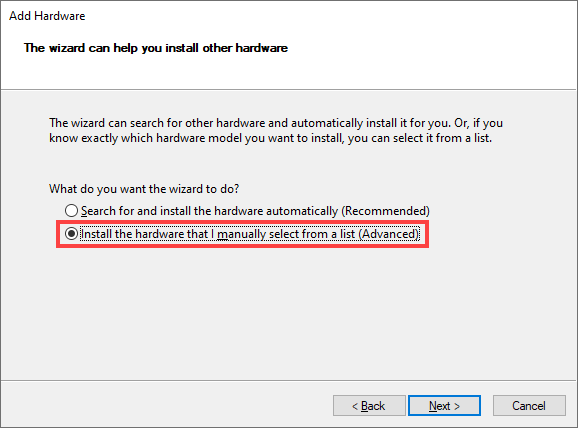 Pick the Install the hardware that I manually select from a list (Advanced) option and select Next.