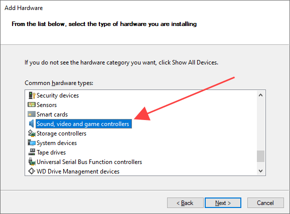 - Pick Sound, video and game controllers as the hardware type and select Next.