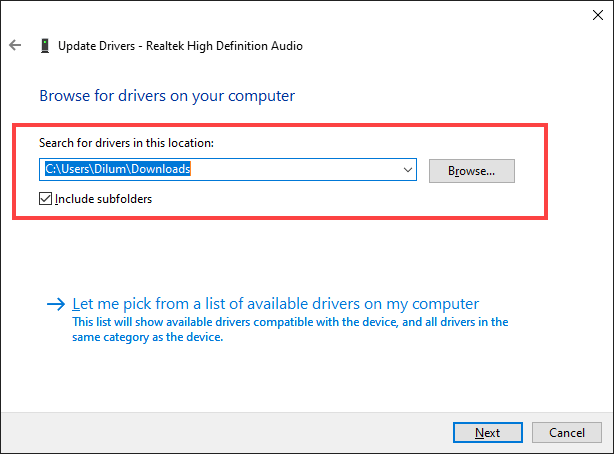 Use the **Browse **button to locate the folder containing the downloaded drivers.