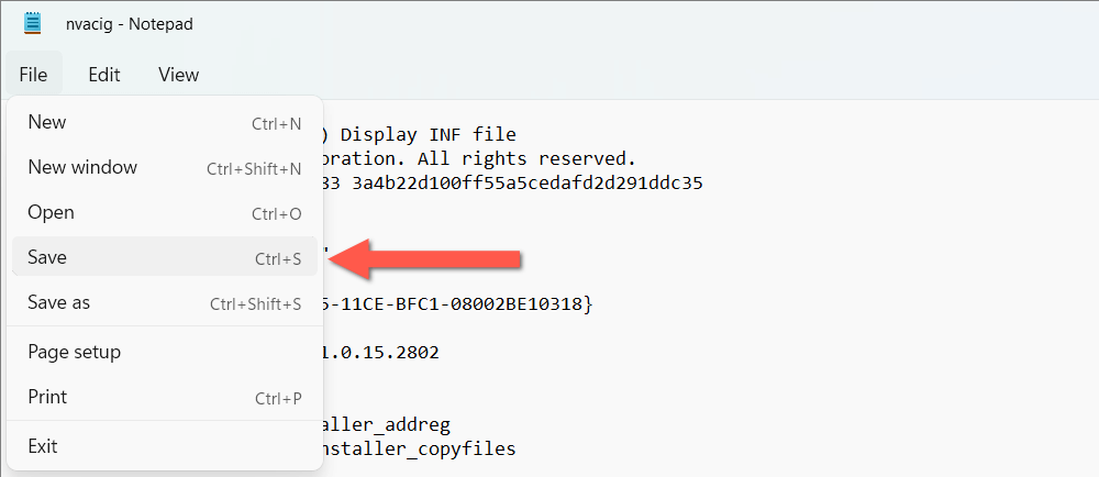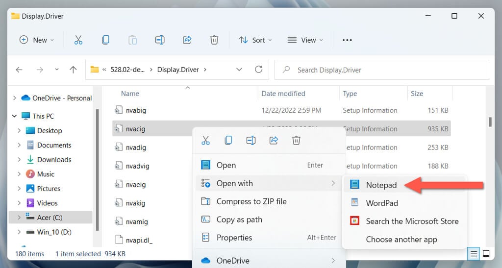 - Right-click the file labeled nvaci.inf or nvacig.inf and select Open with > Notepad.